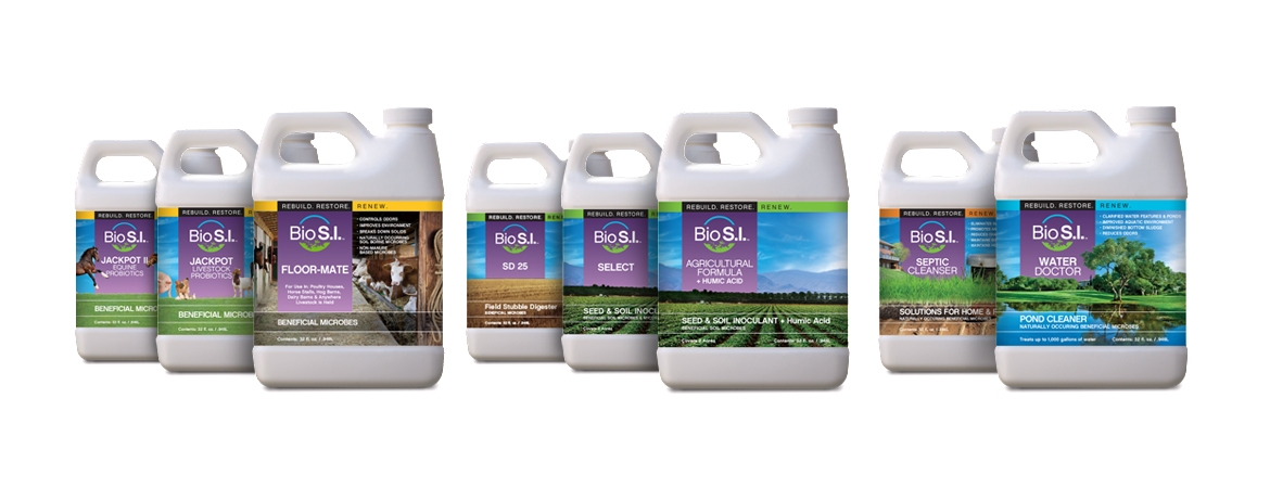 Bio S.I. Technology, LLC has decades of experience producing environmentally friendly solutions for farm, home and garden. Bio S.I. creates microbial products to improve the health of soil, water, crops, and livestock – naturally and safely. Their full range of microbial inoculants includes Bio S.I. Lawn & Garden Formula, Septic Cleanser Formula, Remediation Formula and Jackpot I & II – a new, all-natural probiotic products formulated to bring beneficial soil borne microbes inside the digestive tracts of livestock and equine. Benefits include more efficient water usage, healthy soil, vigorous root systems, high quality crops, healthier livestock digestive systems, and increased profits for farmers and ranchers.
